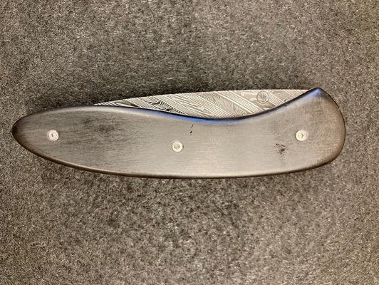 Prototyp: Eigenbau mit Knopföffnung und obenliegender, vollintegrierter Feder.120 Lagen Banddamast, 56 HRc, 75 Bess, Liner aus Titan, Griff aus stabilisierter Trüffelbuche