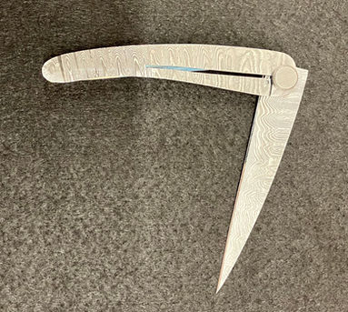 Allesamt von mir entwickelt und aus meinem Atelier stammend. Klinge aus 120 Lagendamast „kleine Rosen“, 62 HRc, 110 Bess, 80 mm lang. Liner 112 mm lang aus TitanGr 5 mit zwei integrierten Federn. Griffmaterial aus Damastbacken und natürlich belassenem Mammutelfenbein.